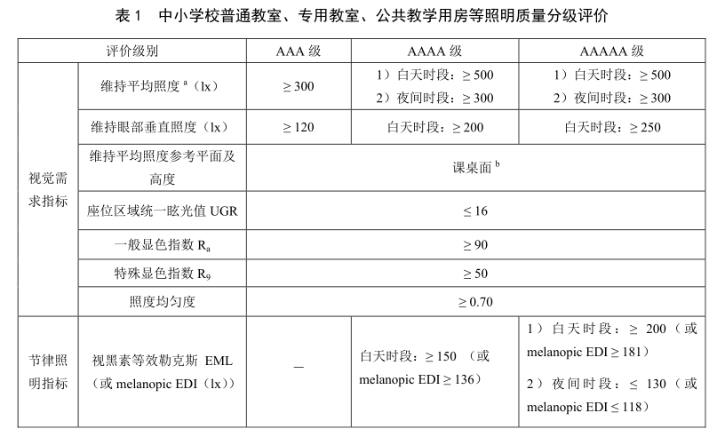 本標準在照明質量分級評價中不僅規(guī)定了視覺需求指標,還規(guī)定了節(jié)律照明指標,還有照明系統(tǒng)要求與節(jié)能要求。